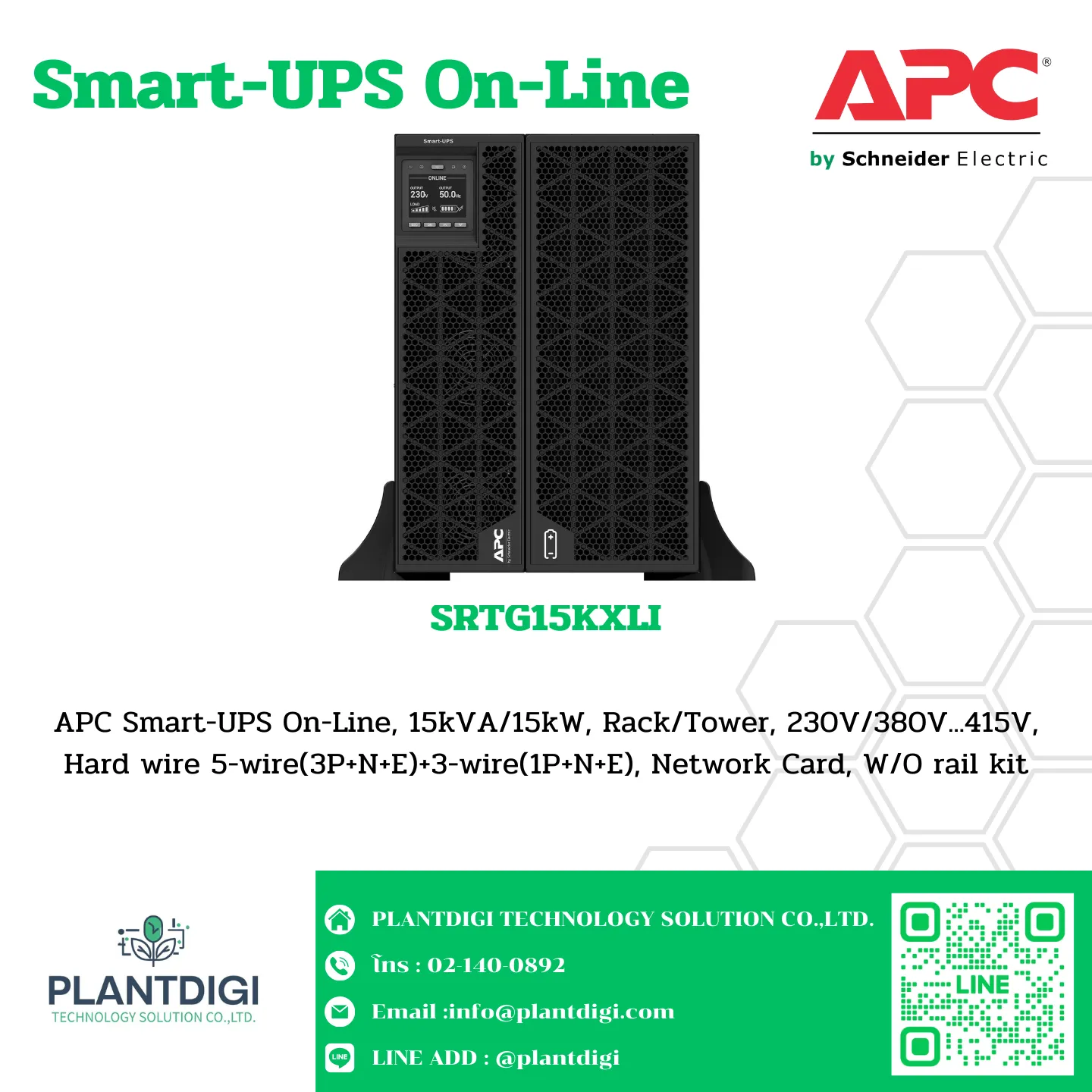APC Smart-UPS On-Line, 15kVA/15kW, Rack/Tower, 230V/380V…415V, Hard wire 5-wire(3P+N+E)+3-wire(1P+N+E), Network Card, W/O rail kit