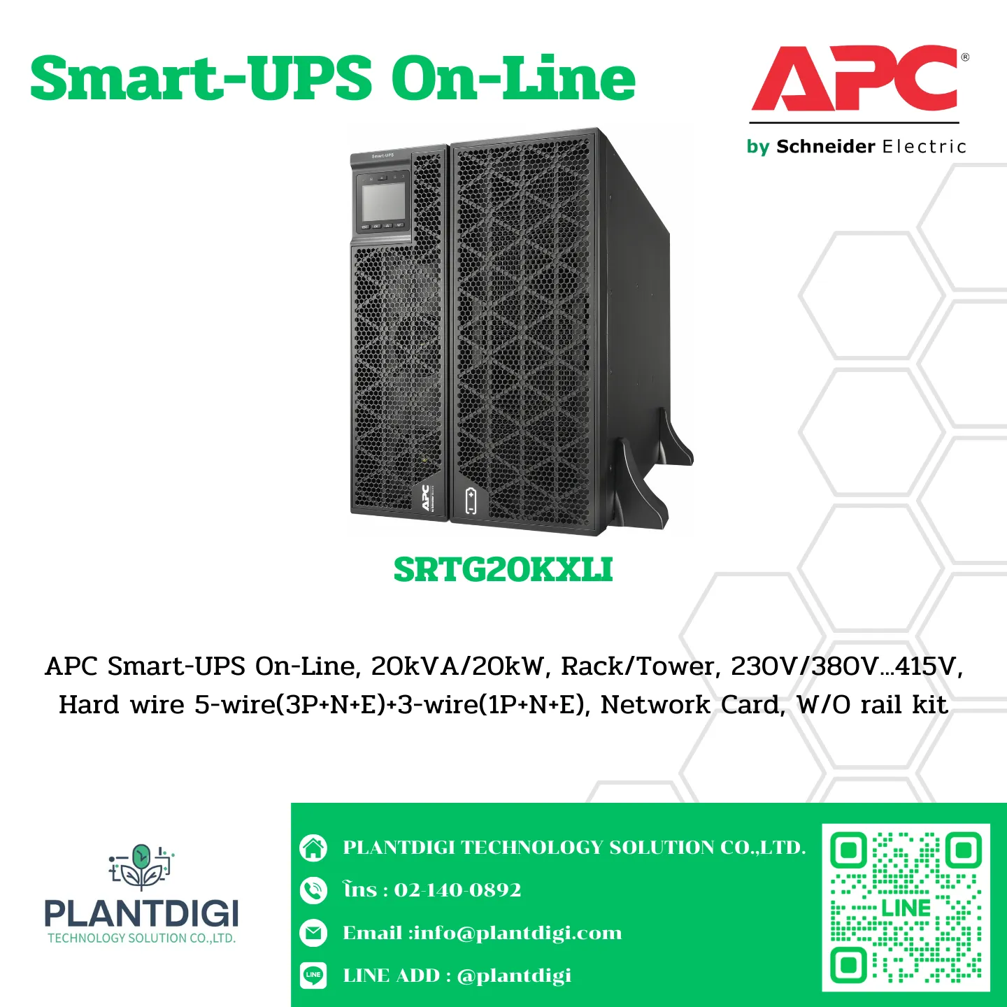 APC Smart-UPS On-Line, 20kVA/20kW, Rack/Tower, 230V/380V…415V, Hard wire 5-wire(3P+N+E)+3-wire(1P+N+E), Network Card, W/O rail kit