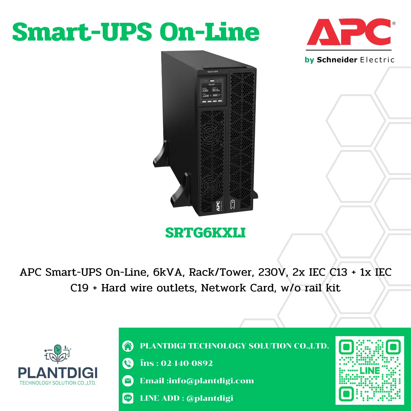 APC Smart-UPS On-Line, 6kVA, Rack/Tower, 230V, 2x IEC C13 + 1x IEC C19 + Hard wire outlets, Network Card, w/o rail kit