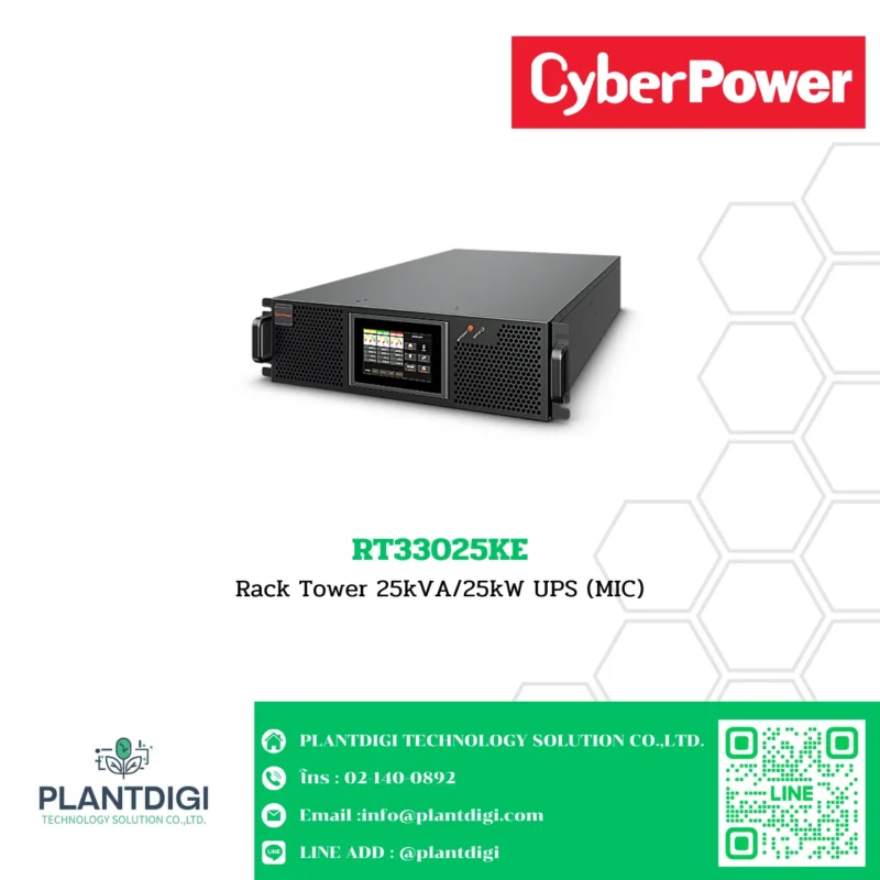 CyberPower RT33025KE guarantees power backup protection for IT equipment such as FTTx devices, networking devices and NAS/storage devices. The product adopts double conversion online topology, and it is typically integrated in the back office, server room, and data center environment. With integrated IGBT technology and intelligent DSP-based control, the RT33 UPS produces less input total harmonic distortion (THDi), achieving higher power efficiency.