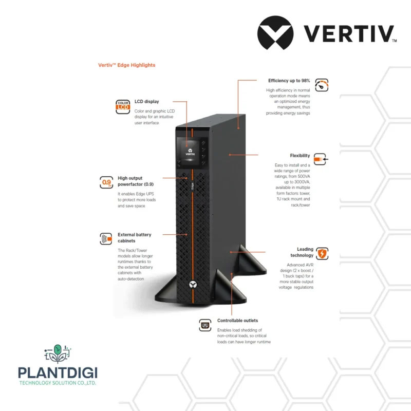 Vertiv Edge is a family of highly reliable, efficient, manageable and flexible line interactive sinewave UPSs, with models ranging from 500VA to 3000VA in tower, rack/tower and rack mount form factors. With a 0.9 power factor, controllable outlets and extended runtime options, Vertiv Edge is the right choice for protecting server and networking equipment in distributed and Edge IT applications. Available in 1U and 2U options as well as a short-depth 3U 3000VA model, it can provide optimum runtime at the right size and power density in a cost effective UPS solution.