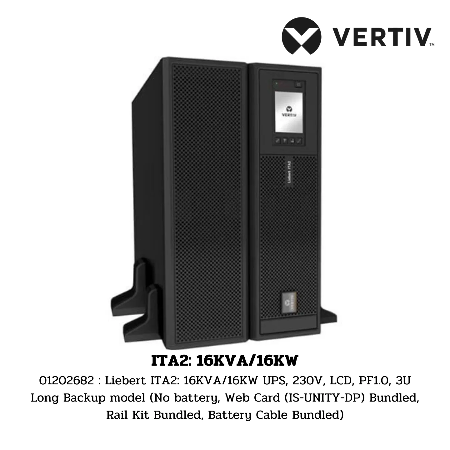 01202682 : Liebert ITA2: 16KVA/16KW UPS, 230V, LCD, PF1.0, 3U Long Backup model (No battery, Web Card (IS-UNITY-DP) Bundled, Rail Kit Bundled, Battery Cable Bundled)