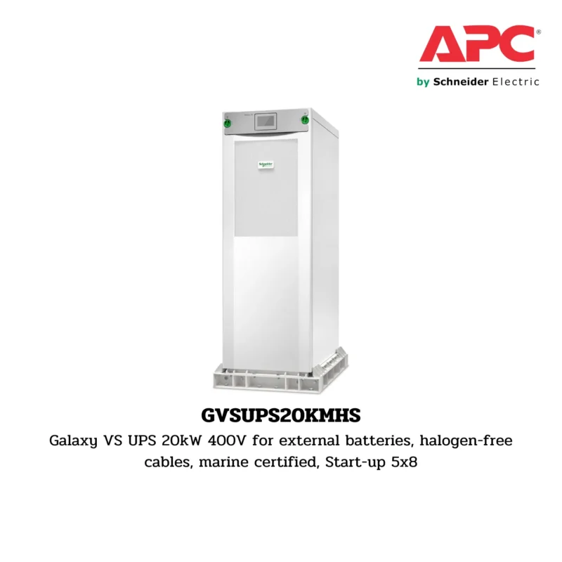 GVSUPS20KMHS APC Highly efficient and easy-to-deploy 20 kW, 400V 3-phase UPS that brings best-in-class power protection and low total cost of ownership to edge, small and medium data centers, as well as to critical infrastructure in commercial and industrial applications. Includes 5×8 start-up service and halogen-free cables. Marine certified.