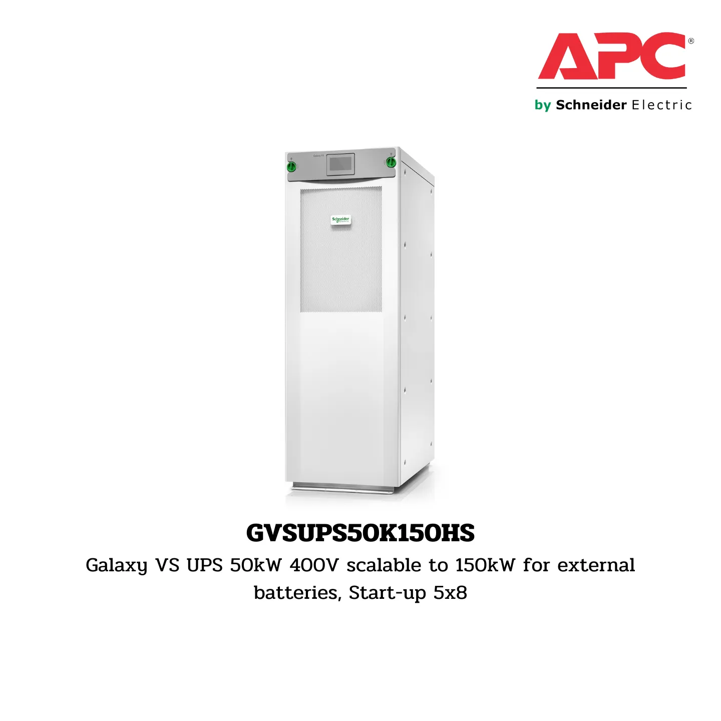GVSUPS50K150HS APC Highly efficient and easy-to-deploy 50 kW scalable to 150 kW, 400V 3-phase UPS for external batteries that brings best-in-class power protection and low total cost of ownership to edge, small and medium data centers, as well as to critical infrastructure in commercial and industrial applications. Includes 5×8 start-up service.