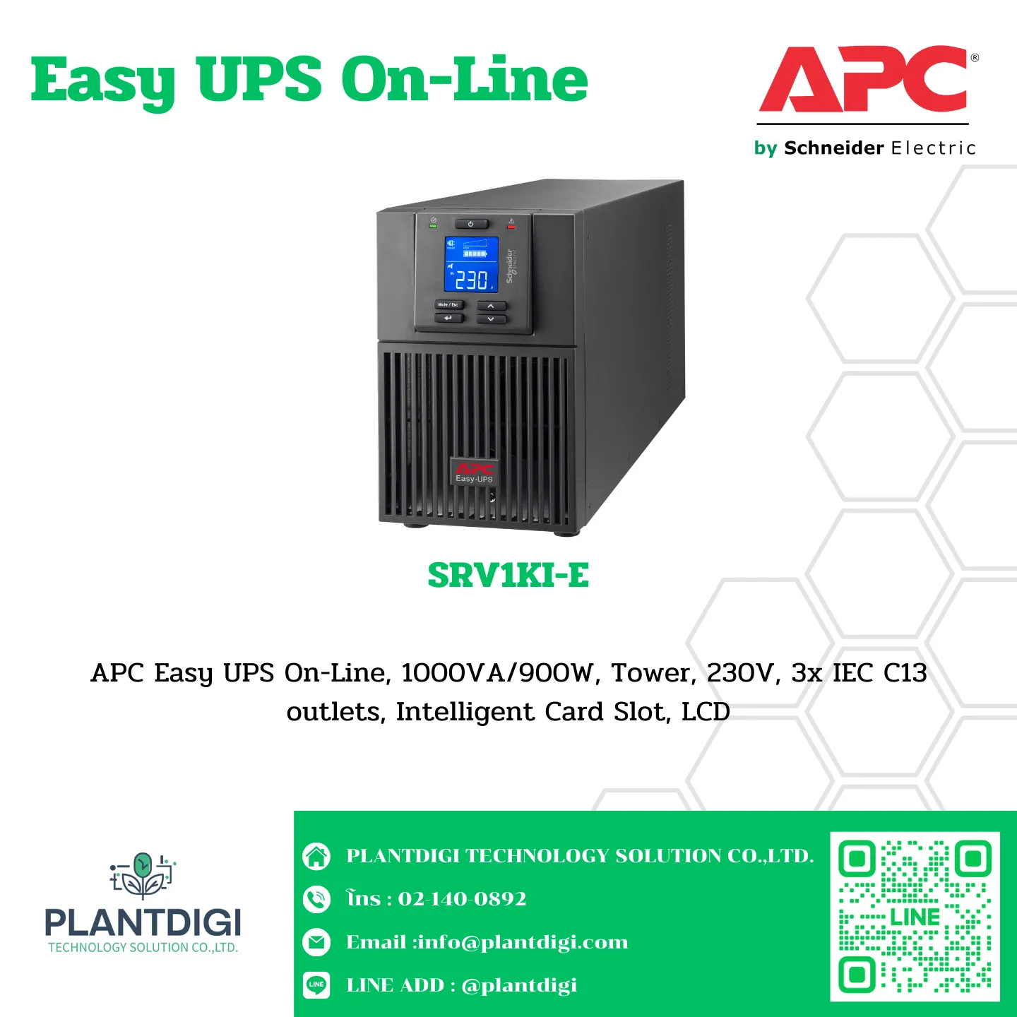 APC Easy UPS On-Line, 1000VA/900W, Tower, 230V, 3x IEC C13 outlets, Intelligent Card Slot, LCD
