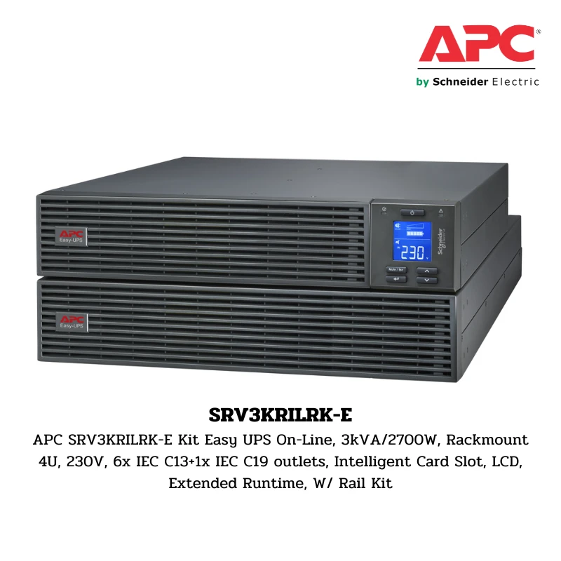 APC SRV3KRILRK-E Kit Easy UPS On-Line, 3kVA/2700W, Rackmount 4U, 230V, 6x IEC C13+1x IEC C19 outlets, Intelligent Card Slot, LCD, Extended Runtime, W/ Rail Kit