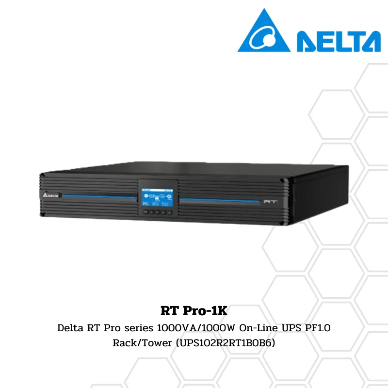 เครื่องสำรองไฟ Delta RT Pro Series RT Pro-1K 1000VA/1000W On-Line UPS PF1.0 Rack/Tower (UPS102R2RT1B0B6) เหมาะสำหรับอุปกรณ์ที่ต้องการความเสถียรสูง เช่น เซิร์ฟเวอร์หรืออุปกรณ์การแพทย์ ด้วยค่า Power Factor 1.0 และคลื่นแบบ Pure Sine Wave ทำให้จ่ายไฟได้เต็มประสิทธิภาพ พร้อมดีไซน์แบบ Rack/Tower ที่ติดตั้งได้หลากหลายและรับประกันแบบ Onsite นาน 3 ปี
