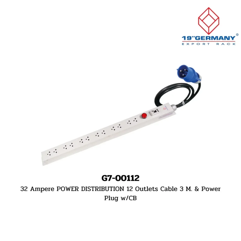 Overview: The G7-00112 32 Ampere Power Distribution unit features 12 outlets with a 3-meter cable, a power plug, and a circuit breaker (CB). This accessory is part of the 19” German Rack’s Accessories sub-range within the GERMANY RACK range