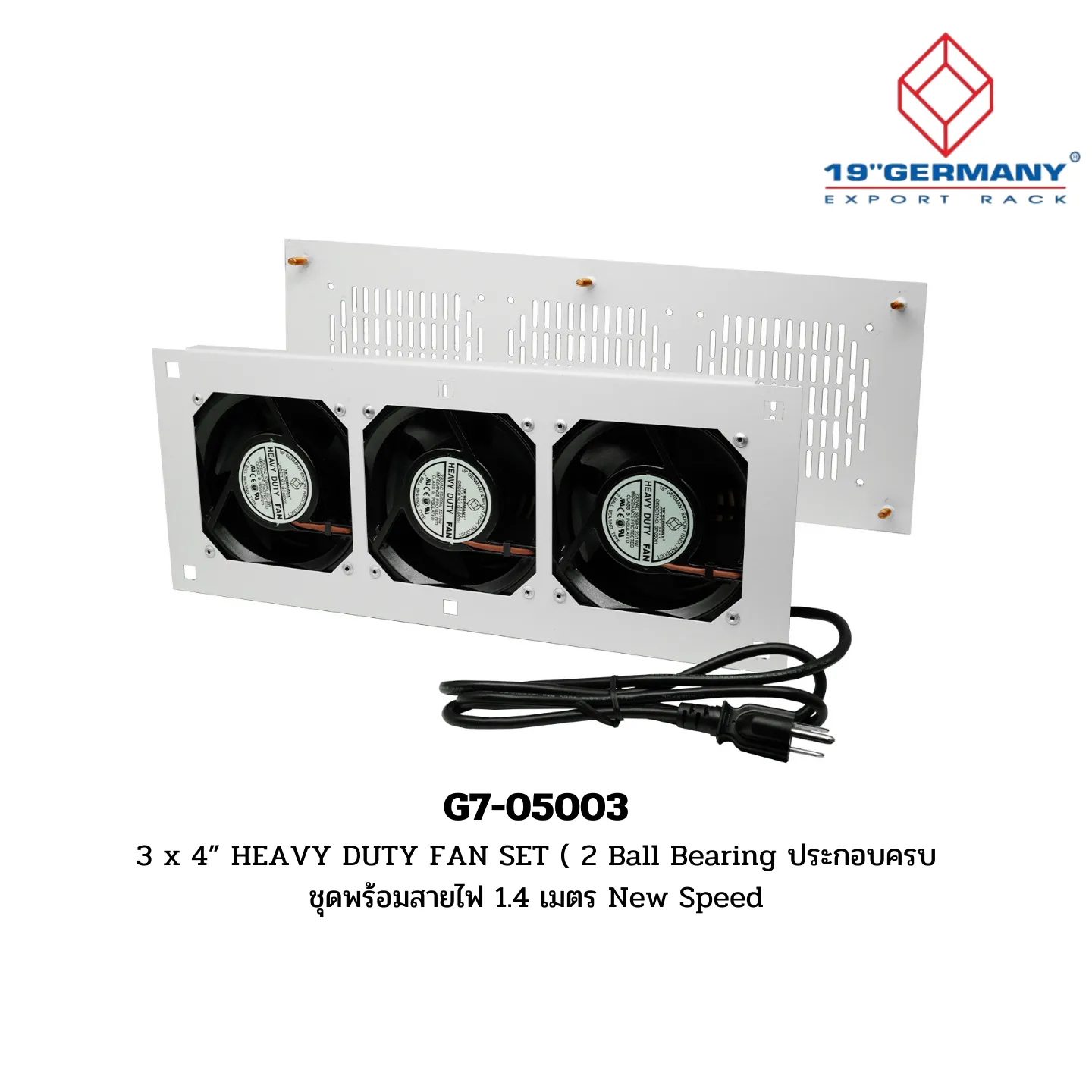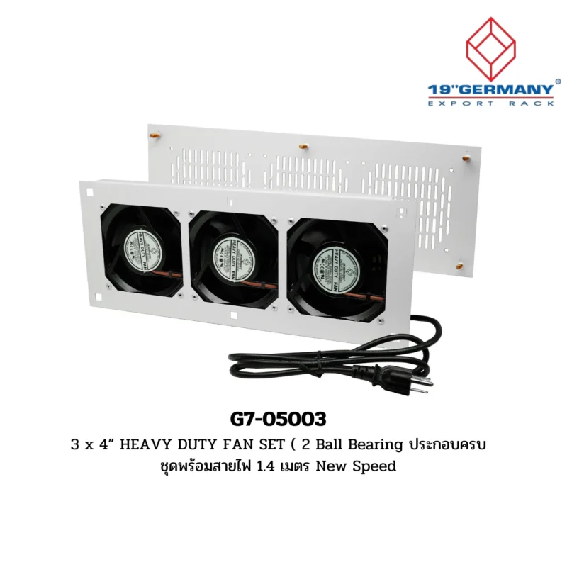 Overview: The G7-05003 Heavy Duty Fan Set features three 4” fans with 2 ball bearings, fully assembled with a 1.4-meter power cord. This accessory is part of the 19” German Rack’s Accessories sub-range within the GERMANY RACK range.
