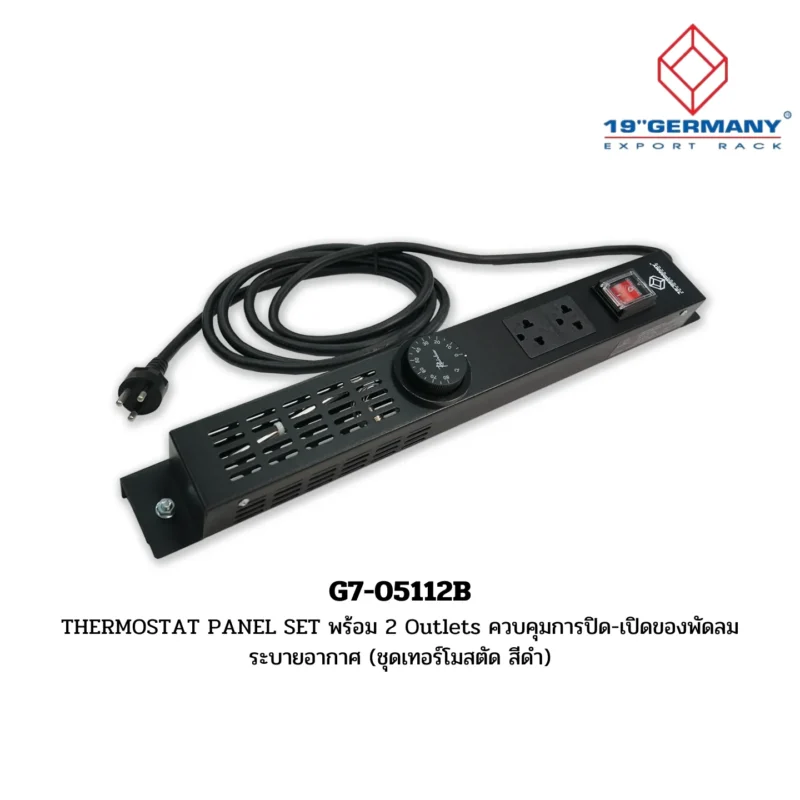 Overview: The G7-05112B Thermostat Panel Set features 2 outlets and controls the on-off operation of cooling fans. This accessory is part of the 19” German Rack’s Accessories sub-range within the GERMANY RACK range.