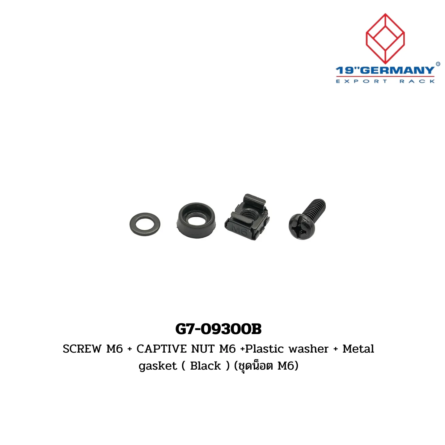 Overview: The G7-09300B Screw Set includes M6 screws, captive nuts, plastic washers, and metal gaskets in a sleek black finish. This accessory is part of the 19” German Rack’s Accessories sub-range within the GERMANY RACK range.