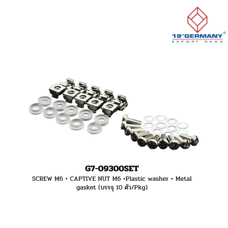 Overview: The G7-09300SET Screw Set includes M6 screws, captive nuts, plastic washers, and metal gaskets, packaged in sets of 10 pieces. This accessory is part of the 19” German Rack’s Accessories sub-range within the GERMANY RACK range.