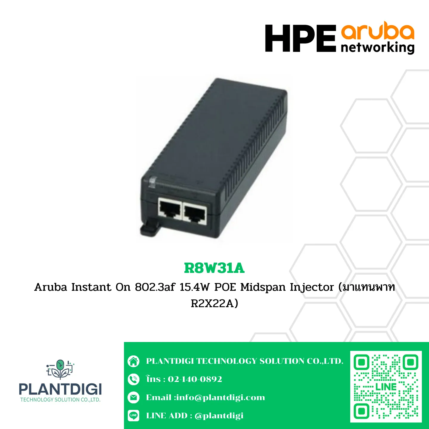 The Aruba Instant On 802.3af 15.4W POE Midspan Injector (R8W31A) is designed to provide power and data to Aruba Instant On access points and other compatible devices. This injector replaces the R2X22A model, offering a reliable and efficient power solution.
