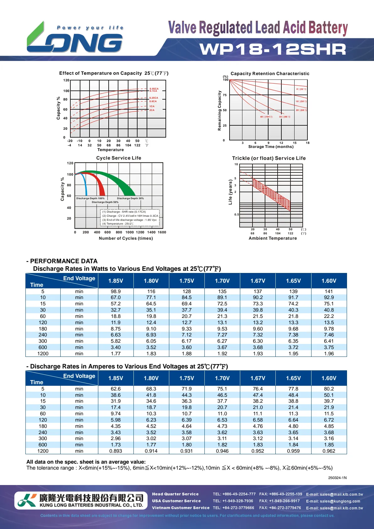 - 5 hour rate (3.06A to 10.20V) 15.3Ah