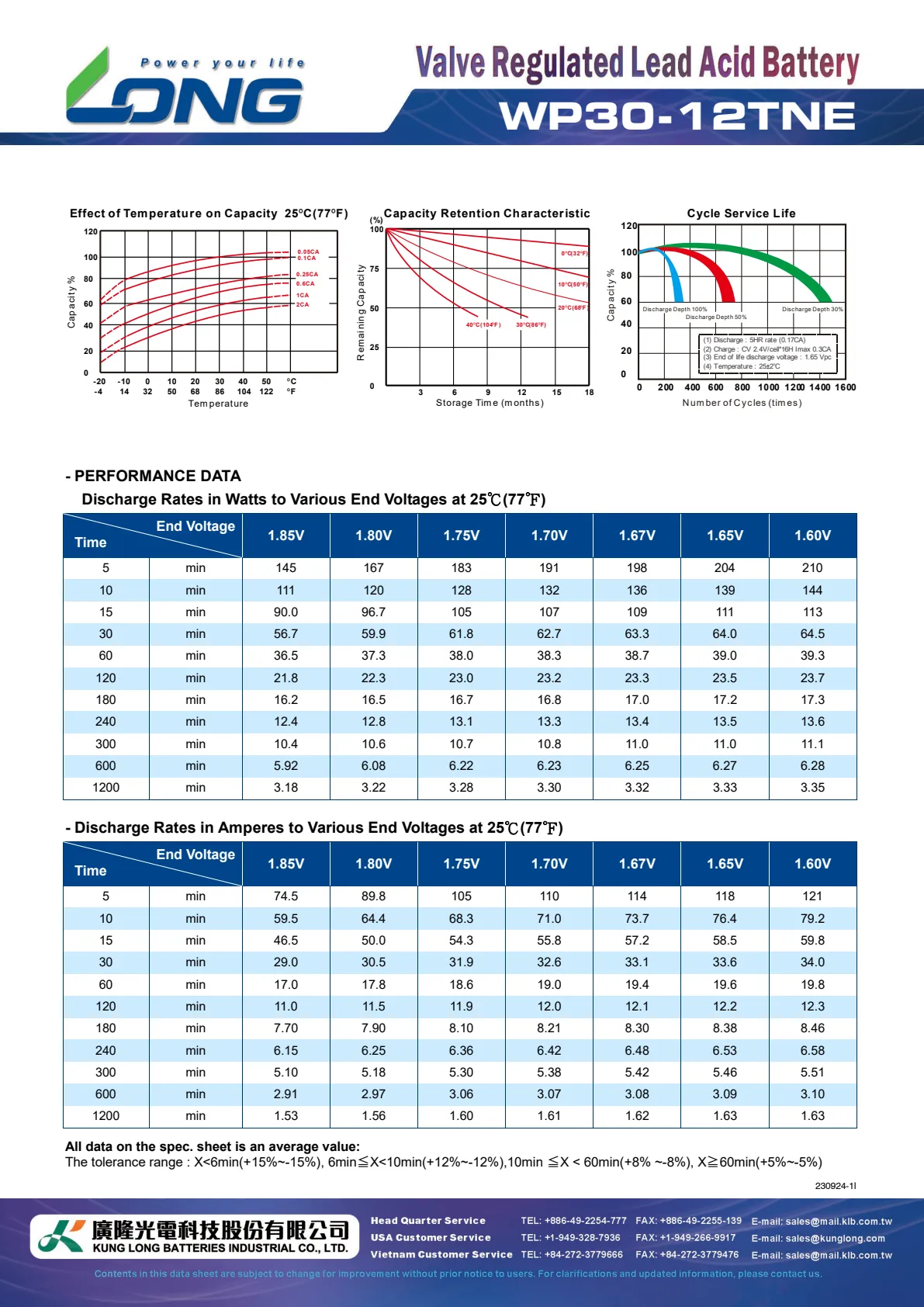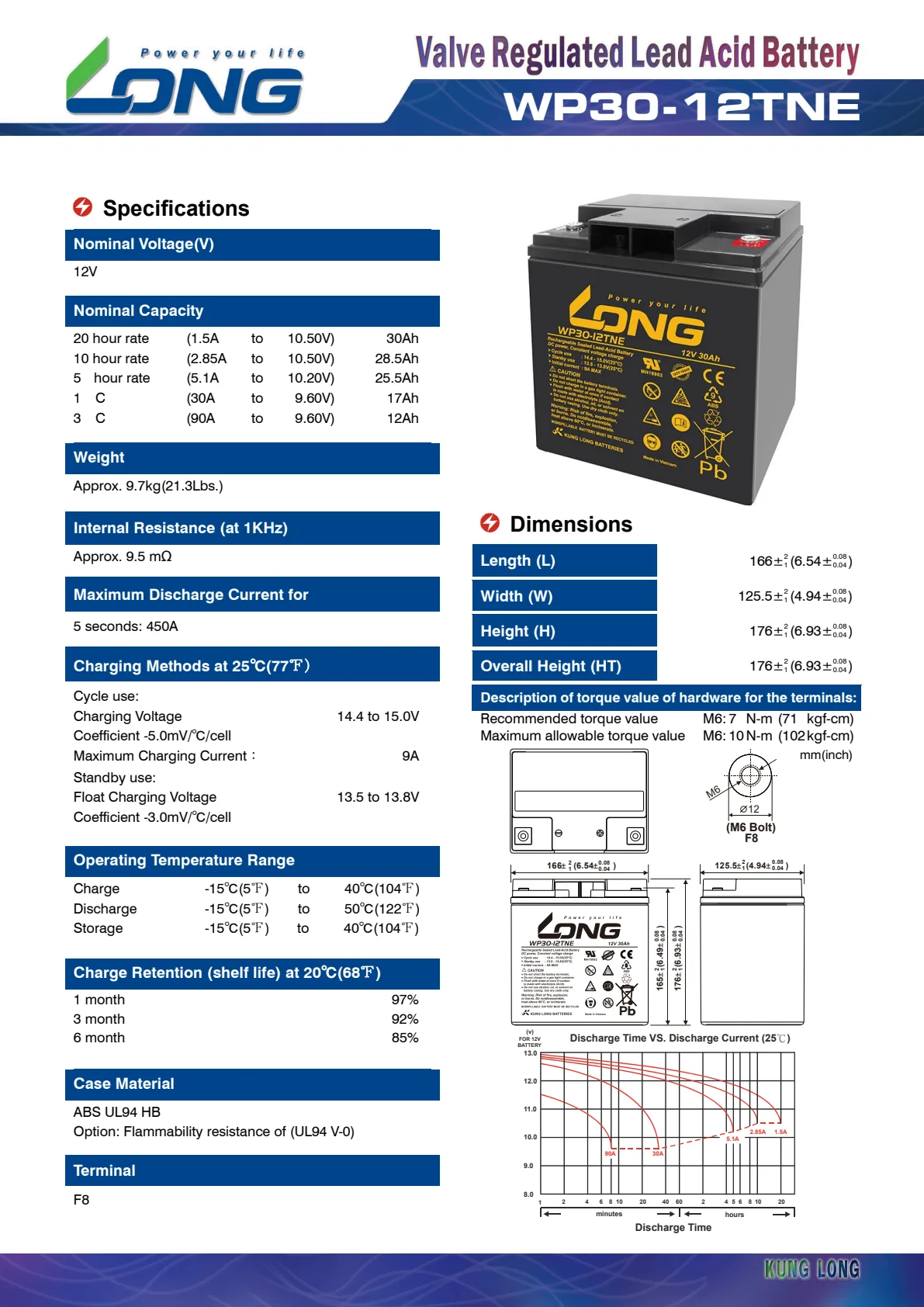 - 20 hour rate (1.5A to 10.50V) 30Ah