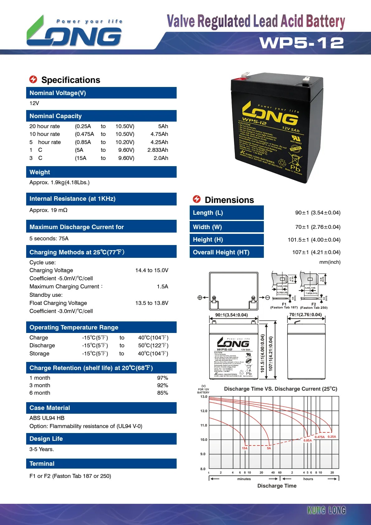 - 20 hour rate (0.25A to 10.50V) 5Ah