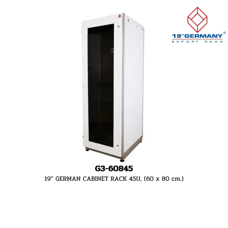 Overview: The G3-60845 19” German Cabinet Rack, featuring a 45U capacity and dimensions of 60 x 80 x 218.5 cm, comes in a sleek two-tone white-gray finish. This cabinet rack is part of the 19″ German Cabinet Rack sub-range within the GERMANY RACK range, and it is a product of the G3 Series by GERMAN RACK.