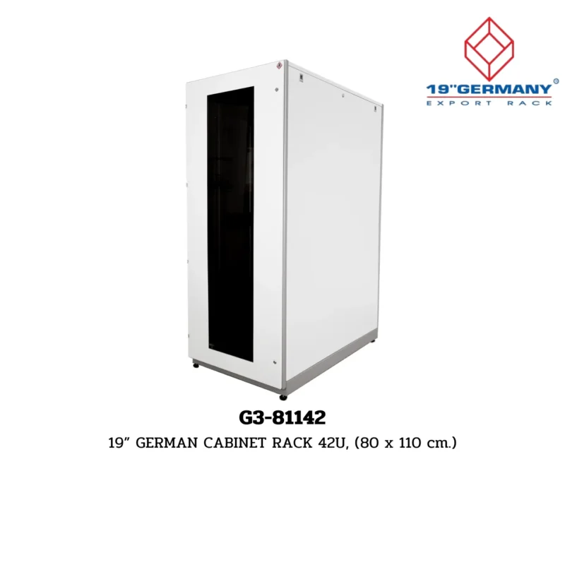 Overview: The G3-81142 19” German Cabinet Rack, featuring a 42U capacity and dimensions of 80 x 110 x 205 cm, comes in a sleek two-tone white-gray finish. This cabinet rack is part of the 19″ German Cabinet Rack sub-range within the GERMANY RACK range, and it is a product of the G3 Series by GERMAN RACK.