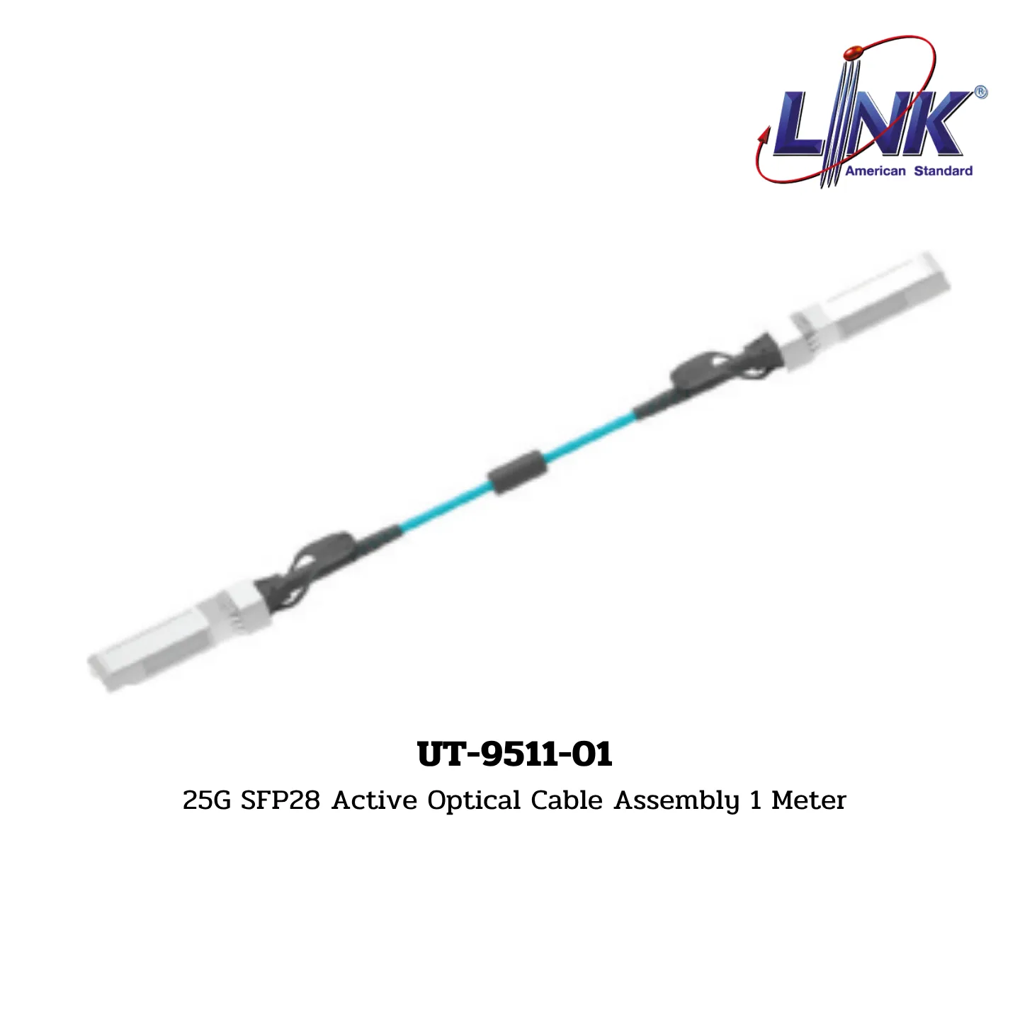 สินค้า 25G SFP28 Active Optical Cable Assembly 1 Meter รหัส UT-9511-01 จากแบรนด์ LINK คือ สายเคเบิลออปติกแบบแอคทีฟ (AOC) ที่ใช้เทคโนโลยีไฟเบอร์ออปติกในการส่งข้อมูล โดยมีหัวต่อ SFP28 และวงจรอิเล็กทรอนิกส์สำหรับการแปลงสัญญาณติดตั้งอยู่ภายในหัวต่อทั้งสองด้าน สายเคเบิลนี้ถูกออกแบบมาเพื่อใช้เชื่อมต่ออุปกรณ์เครือข่ายความเร็วสูงภายในศูนย์ข้อมูล (Data Center) โดยรองรับความเร็ว 25 Gigabit Ethernet (25G) มีความยาว 1 เมตร