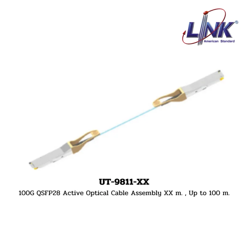 สินค้า 100G QSFP28 Active Optical Cable Assembly XX m. , Up to 100 m. รหัส UT-9811-XX จากแบรนด์ LINK คือ สายเคเบิลออปติกแบบแอคทีฟ (AOC) ที่ใช้เทคโนโลยีไฟเบอร์ออปติกในการส่งข้อมูล โดยมีหัวต่อ QSFP28 และวงจรอิเล็กทรอนิกส์สำหรับการแปลงสัญญาณติดตั้งอยู่ภายในหัวต่อทั้งสองด้าน สายเคเบิลนี้ถูกออกแบบมาเพื่อใช้เชื่อมต่ออุปกรณ์เครือข่ายความเร็วสูงพิเศษภายในศูนย์ข้อมูล (Data Center) โดยรองรับความเร็ว 100 Gigabit Ethernet (100G) และมีช่วงความยาวที่ ยาวเป็นพิเศษ ตั้งแต่ 1 เมตร จนถึง 100 เมตร