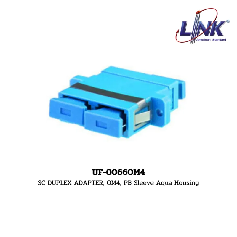 สินค้า SC DUPLEX ADAPTER, OM4, PB Sleeve Aqua Housing รหัส UF-0066OM4 จากแบรนด์ LINK คือ อะแดปเตอร์ (Adapter) สำหรับเชื่อมต่อหัวต่อไฟเบอร์ออปติกชนิด SC Duplex (เชื่อมต่อ 2 คอร์พร้อมกัน) เข้าด้วยกัน อะแดปเตอร์นี้ออกแบบมาสำหรับสาย Multi-mode OM4 ซึ่งเป็นมาตรฐานความเร็วสูง มี ปลอกหุ้ม (Sleeve) ที่ทำจาก Phosphor Bronze (PB) และตัวเรือน (Housing) เป็นสี ฟ้าอมเขียว (Aqua) ซึ่งเป็นสีมาตรฐานที่ใช้ระบุว่าเป็น Multi-mode OM3/OM4