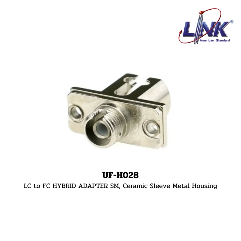 สินค้า LC to FC HYBRID ADAPTER SM, Ceramic Sleeve Metal Housing รหัส UF-H028 จากแบรนด์ LINK คือ อะแดปเตอร์ไฮบริด (Hybrid Adapter) สำหรับเชื่อมต่อหัวต่อไฟเบอร์ออปติก ต่างชนิดกัน นั่นคือด้านหนึ่งเป็น LC Simplex และอีกด้านหนึ่งเป็น FC Simplex อะแดปเตอร์นี้ออกแบบมาสำหรับสาย Single-mode (SM) มี ปลอกหุ้ม (Sleeve) ที่ทำจาก Ceramic (เซรามิก) เพื่อความแม่นยำสูง และใช้ ตัวเรือน (Housing) โลหะ (Metal) เพื่อความทนทาน