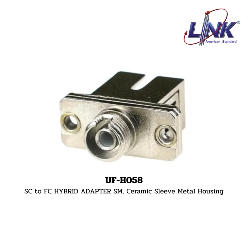 สินค้า SC to FC HYBRID ADAPTER SM, Ceramic Sleeve Metal Housing รหัส UF-H058 จากแบรนด์ LINK คือ อะแดปเตอร์ไฮบริด (Hybrid Adapter) สำหรับเชื่อมต่อหัวต่อไฟเบอร์ออปติก ต่างชนิดกัน นั่นคือด้านหนึ่งเป็น SC Simplex และอีกด้านหนึ่งเป็น FC Simplex อะแดปเตอร์นี้ออกแบบมาสำหรับสาย Single-mode (SM) มี ปลอกหุ้ม (Sleeve) ที่ทำจาก Ceramic (เซรามิก) เพื่อความแม่นยำสูง และใช้ ตัวเรือน (Housing) โลหะ (Metal) เพื่อความทนทาน