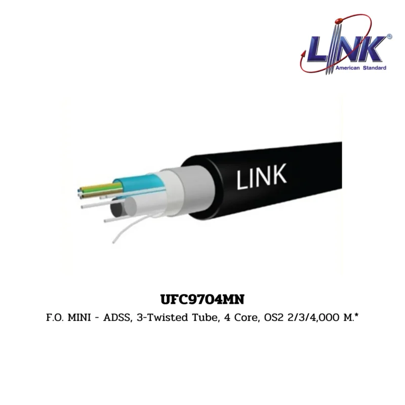 สินค้า F.O. MINI – ADSS, 3-Twisted Tube, 4 Core, OS2 รหัส UFC9704MN จากแบรนด์ LINK คือสายไฟเบอร์ออปติกสำหรับติดตั้งภายนอกอาคารที่มีโครงสร้างแบบ Mini ADSS (All-Dielectric Self-Support Cable) หมายความว่าสายทั้งหมดเป็น ฉนวน (Dielectric) ไม่มีส่วนประกอบที่เป็นโลหะ ทำให้ปลอดภัยเมื่อติดตั้งใกล้สายไฟฟ้าแรงสูง และมีคุณสมบัติ รับน้ำหนักได้ด้วยตัวเอง เหมาะสำหรับการติดตั้งแบบ แขวนเสาอากาศ (Aerial Installation) มีจำนวน 4 Core เป็นชนิด Single-Mode (OS2) โครงสร้างสายจัดเก็บ Core ในรูปแบบ 3-Twisted Tube (ท่อบิดเกลียว 3 ท่อ) และมีความทนทานต่อแรงดึงสูงถึง 1,200 N