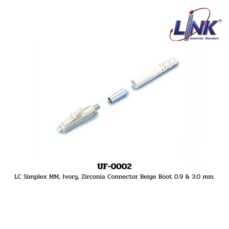 สินค้า LC Simplex MM, Ivory, Zirconia Connector Beige Boot 0.9 & 3.0 mm. รหัส UF-0002 จากแบรนด์ LINK คือ หัวต่อ (Connector) สำหรับเชื่อมต่อสายไฟเบอร์ออปติก มีชนิดเป็น LC (Lucent Connector) แบบ Simplex (หัวเดี่ยว) ใช้กับสายชนิด Multi-Mode (MM) ตัวหัวต่อทำจากวัสดุเซรามิก Zirconia มีคุณสมบัติทนทานและให้การเชื่อมต่อที่แม่นยำ เหมาะสำหรับเข้าหัวสายได้ทั้งขนาด 0.9 มม. (สำหรับ Pigtail) และ 3.0 มม. (สำหรับ Patch Cord)