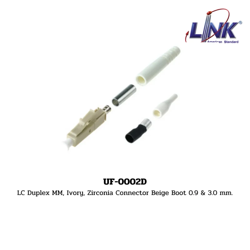 สินค้า LC Duplex MM, Ivory, Zirconia Connector Beige Boot 0.9 & 3.0 mm. รหัส UF-0002D จากแบรนด์ LINK คือ หัวต่อ (Connector) สำหรับเชื่อมต่อสายไฟเบอร์ออปติก มีชนิดเป็น LC (Lucent Connector) แบบ Duplex (หัวคู่) ใช้กับสายชนิด Multi-Mode (MM) ตัวหัวต่อทำจากวัสดุเซรามิก Zirconia มีคุณสมบัติทนทานและให้การเชื่อมต่อที่แม่นยำ เหมาะสำหรับเข้าหัวสายได้ทั้งขนาด 0.9 มม. (สำหรับ Pigtail) และ 3.0 มม. (สำหรับ Patch Cord)