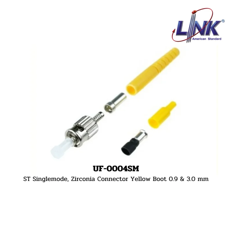 สินค้า ST Singlemode, Zirconia Connector Yellow Boot 0.9 & 3.0 mm. รหัส UF-0004SM จากแบรนด์ LINK คือ หัวต่อ (Connector) สำหรับเชื่อมต่อสายไฟเบอร์ออปติก มีชนิดเป็น ST (Straight Tip) ซึ่งเป็นหัวต่อแบบ Bayonet Mount ใช้กับสายชนิด Single-Mode (SM) ตัวหัวต่อทำจากวัสดุเซรามิก Zirconia มีคุณสมบัติทนทานและให้การเชื่อมต่อที่แม่นยำ ปลอกหุ้มมีสีเหลือง (Yellow Boot) ซึ่งเป็นสีมาตรฐานสำหรับสาย Single-Mode เหมาะสำหรับเข้าหัวสายได้ทั้งขนาด 0.9 มม. (สำหรับ Pigtail) และ 3.0 มม. (สำหรับ Patch Cord)