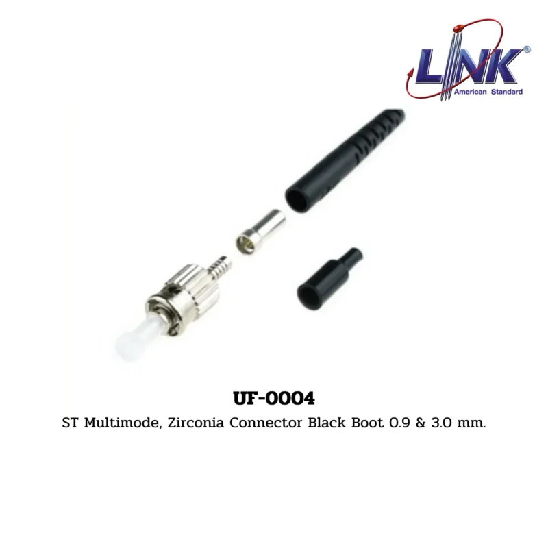 สินค้า ST Multimode, Zirconia Connector Black Boot 0.9 & 3.0 mm. รหัส UF-0004 จากแบรนด์ LINK คือ หัวต่อ (Connector) สำหรับเชื่อมต่อสายไฟเบอร์ออปติก มีชนิดเป็น ST (Straight Tip) ซึ่งเป็นหัวต่อแบบ Bayonet Mount ใช้กับสายชนิด Multi-Mode (MM) ตัวหัวต่อทำจากวัสดุเซรามิก Zirconia มีคุณสมบัติทนทานและให้การเชื่อมต่อที่แม่นยำ เหมาะสำหรับเข้าหัวสายได้ทั้งขนาด 0.9 มม. (สำหรับ Pigtail) และ 3.0 มม. (สำหรับ Patch Cord)