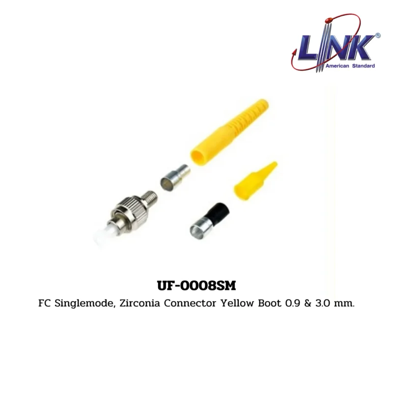 สินค้า FC Singlemode, Zirconia Connector Yellow Boot 0.9 & 3.0 mm. รหัส UF-0008SM จากแบรนด์ LINK คือ หัวต่อ (Connector) สำหรับเชื่อมต่อสายไฟเบอร์ออปติก มีชนิดเป็น FC (Ferrule Connector) ใช้กับสายชนิด Single-Mode (SM) หัวต่อมีคุณสมบัติในการยึดติดด้วย เกลียว (Screw Mechanism) ทำให้มีความมั่นคงสูง ตัวหัวต่อทำจากวัสดุเซรามิก Zirconia มีคุณสมบัติทนทานและให้การเชื่อมต่อที่แม่นยำ ปลอกหุ้มมีสีเหลือง (Yellow Boot) ซึ่งเป็นสีมาตรฐานสำหรับสาย Single-Mode เหมาะสำหรับเข้าหัวสายได้ทั้งขนาด 0.9 มม. (สำหรับ Pigtail) และ 3.0 มม. (สำหรับ Patch Cord)