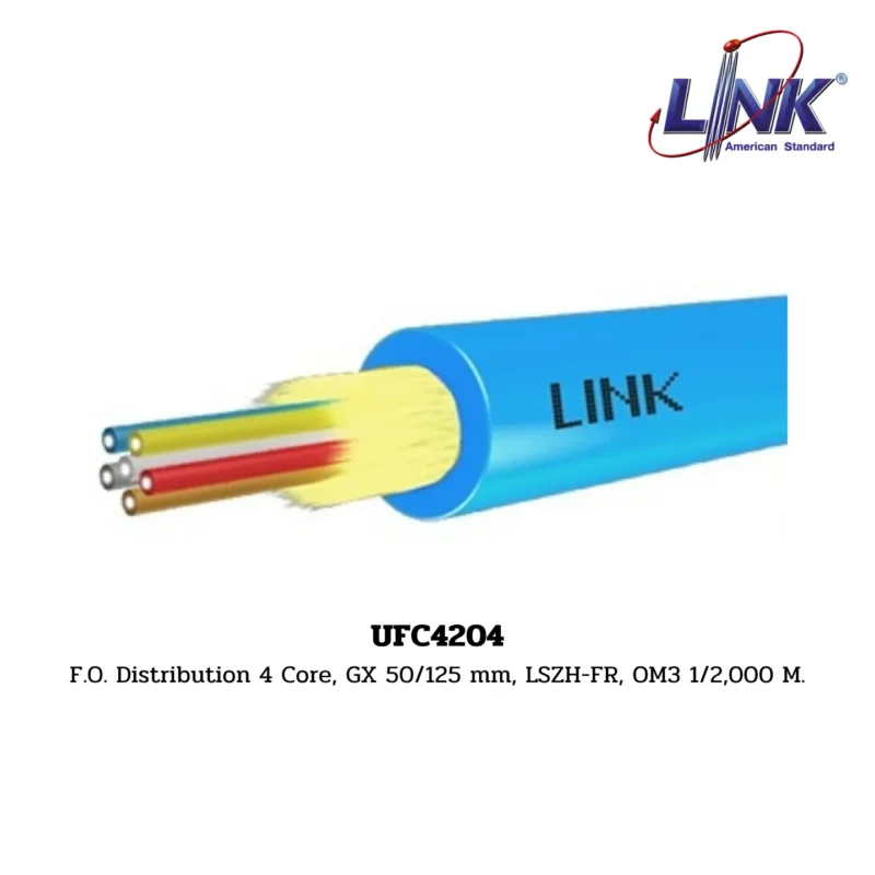 สินค้า F.O. Distribution 4 Core, GX 50/125 μm, LSZH-FR, OM3 รหัส UFC4204 จากแบรนด์ LINK คือสายไฟเบอร์ออปติกสำหรับใช้งานภายในอาคาร (Indoor) มีโครงสร้างแบบ Distribution มีจำนวน 4 Core เป็นชนิด Multi-Mode (OM3) ซึ่งรองรับความเร็วสูงระดับ 10 Gigabit (GX/XG) จุดเด่นคือใช้เปลือกหุ้มชนิด LSZH-FR (Low Smoke Zero Halogen – Fire Retardant) และมีสีฟ้าคราม (Aqua Jacket) ซึ่งเป็นสีมาตรฐานสำหรับสาย OM3 เหมาะสำหรับใช้เป็นสายหลัก (Backbone) ในอาคาร