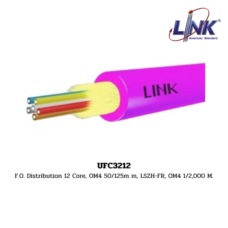 สินค้า F.O. Distribution 12 Core, OM4 50/125 μm, LSZH-FR, OM4 รหัส UFC3212 จากแบรนด์ LINK คือสายไฟเบอร์ออปติกความจุสูงสำหรับใช้งานภายในอาคาร (Indoor) มีโครงสร้างแบบ Distribution มีจำนวน 12 Core เป็นชนิด Multi-Mode (OM4) ซึ่งรองรับความเร็วสูงระดับ 40/100 Gigabit จุดเด่นคือใช้เปลือกหุ้มชนิด LSZH-FR (Low Smoke Zero Halogen – Fire Retardant) และมีสีม่วงแดง (Erika Violet Jacket) ซึ่งเป็นสีมาตรฐานสำหรับสาย OM4 เหมาะสำหรับใช้เป็นสายหลัก (Backbone) ในศูนย์ข้อมูล (Data Center) หรืออาคารขนาดใหญ่