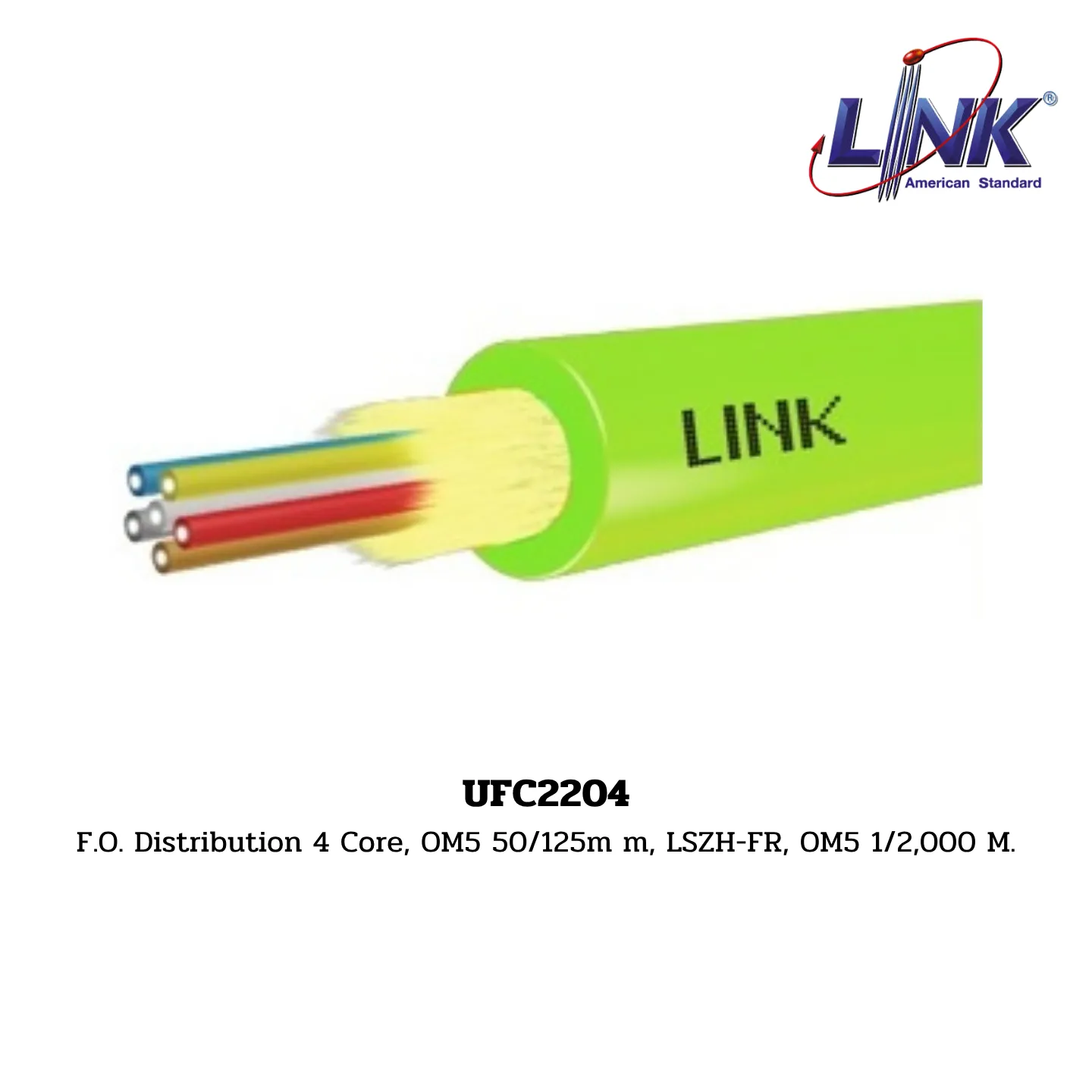 สินค้า F.O. Distribution 4 Core, OM5 50/125 μm, LSZH-FR, OM5 รหัส UFC2204 จากแบรนด์ LINK คือสายไฟเบอร์ออปติกสำหรับใช้งานภายในอาคาร (Indoor) มีโครงสร้างแบบ Distribution มีจำนวน 4 Core เป็นชนิด Multi-Mode (OM5) ซึ่งเป็นเทคโนโลยีใหม่ล่าสุดที่รองรับความเร็วสูงระดับ 40/100/200/400 Gigabit จุดเด่นคือใช้เปลือกหุ้มชนิด LSZH-FR (Low Smoke Zero Halogen – Fire Retardant) และมีสีเขียวมะนาว (Lime Green Jacket) ซึ่งเป็นสีมาตรฐานสำหรับสาย OM5 เหมาะสำหรับใช้เป็นสายหลัก (Backbone) ใน Data Center สมัยใหม่