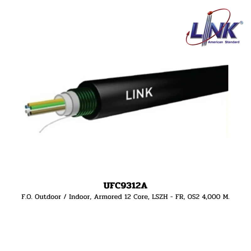 สินค้า F.O. Outdoor / Indoor, Armored 12 Core, LSZH – FR, OS2 รหัส UFC9312A จากแบรนด์ LINK คือสายไฟเบอร์ออปติกความทนทานสูงสำหรับใช้งานติดตั้งได้ทั้ง ภายนอกและภายในอาคาร (Outdoor/Indoor) มีจำนวน 12 Core เป็นชนิด Armored (มีเกราะป้องกัน) เพื่อเพิ่มความแข็งแรงและการป้องกันความเสียหายทางกายภาพสูง ใช้ไฟเบอร์ชนิด Single-Mode (OS2) ตัวเปลือกหุ้มเป็นวัสดุ LSZH-FR (Low Smoke Zero Halogen – Flame Retardant) ที่มีความปลอดภัยสูง