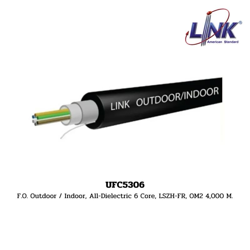 สินค้า F.O. Outdoor / Indoor, All-Dielectric 6 Core, LSZH-FR, OM2 รหัส UFC5306 จากแบรนด์ LINK คือสายไฟเบอร์ออปติกสำหรับใช้งานติดตั้งได้ทั้ง ภายนอกและภายในอาคาร (Outdoor/Indoor) มีจำนวน 6 Core เป็นชนิด Multi-Mode (OM2) ซึ่งเหมาะสำหรับเครือข่ายความเร็วสูงในระยะทางสั้นถึงปานกลาง โครงสร้างสายเป็นแบบ All-Dielectric (ไม่มีส่วนประกอบที่เป็นโลหะ) และเปลือกหุ้มเป็นวัสดุ LSZH-FR (Low Smoke Zero Halogen – Flame Retardant) ที่มีความปลอดภัยสูง