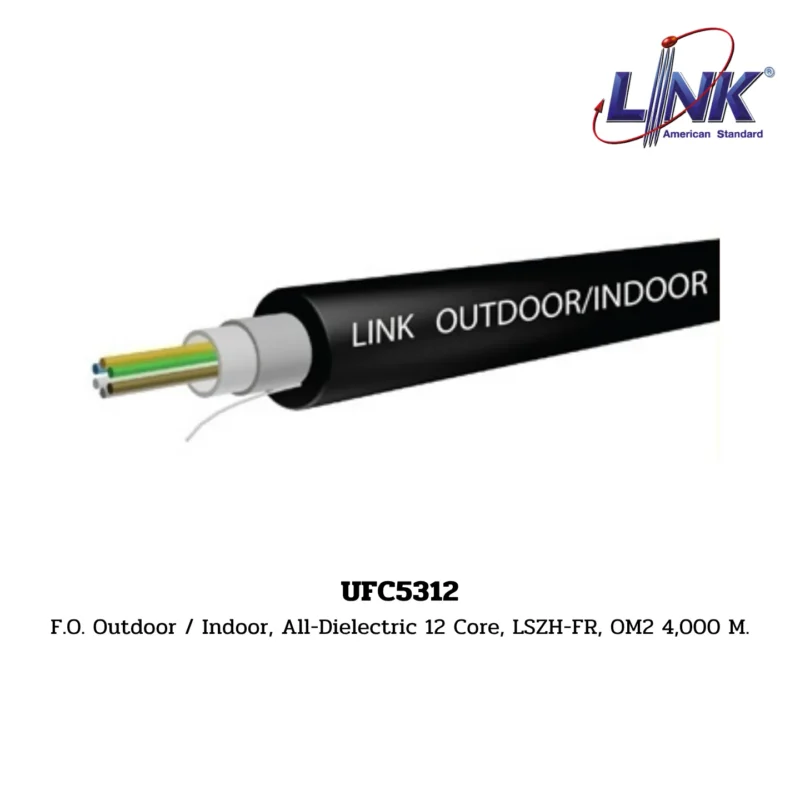 สินค้า F.O. Outdoor / Indoor, All-Dielectric 12 Core, LSZH-FR, OM2 รหัส UFC5312 จากแบรนด์ LINK คือสายไฟเบอร์ออปติกสำหรับใช้งานติดตั้งได้ทั้ง ภายนอกและภายในอาคาร (Outdoor/Indoor) มีจำนวน 12 Core เป็นชนิด Multi-Mode (OM2) ซึ่งเหมาะสำหรับเครือข่ายความเร็วสูงในระยะทางสั้นถึงปานกลาง โครงสร้างสายเป็นแบบ All-Dielectric (ไม่มีส่วนประกอบที่เป็นโลหะ) และเปลือกหุ้มเป็นวัสดุ LSZH-FR (Low Smoke Zero Halogen – Flame Retardant) ที่มีความปลอดภัยสูง