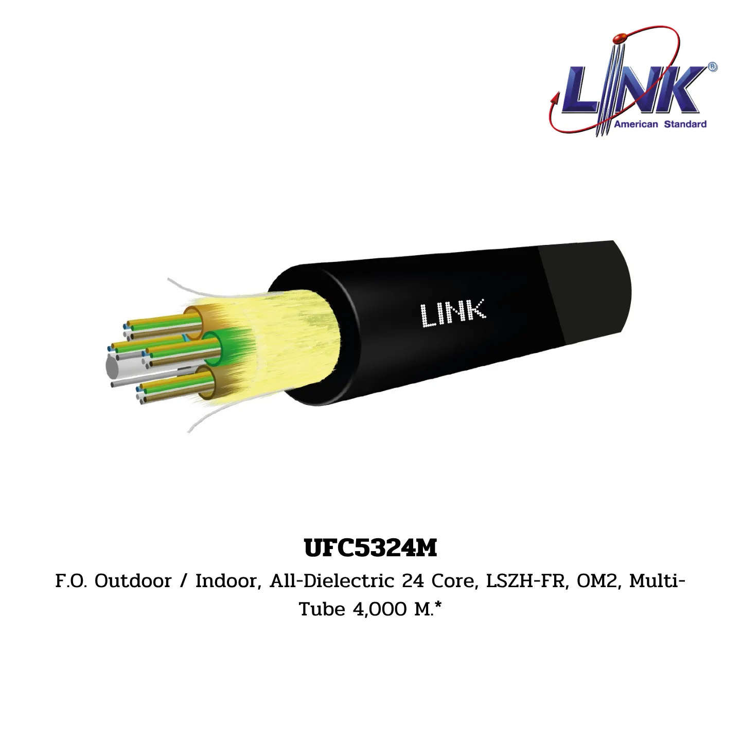 สินค้า F.O. Outdoor / Indoor, All-Dielectric 24 Core, LSZH-FR, OM2, Multi-Tube รหัส UFC5324M จากแบรนด์ LINK คือสายไฟเบอร์ออปติกความจุสูงสำหรับติดตั้งได้ทั้ง ภายนอกและภายในอาคาร (Outdoor/Indoor) มีจำนวน 24 Core เป็นชนิด Multi-Mode (OM2) โครงสร้างสายเป็นแบบ Multi-Tube (หลายท่อ) ใช้ไฟเบอร์ขนาด 50/125 μm และเปลือกหุ้มเป็นวัสดุ LSZH-FR (Low Smoke Zero Halogen – Flame Retardant) ที่มีความปลอดภัยสูง