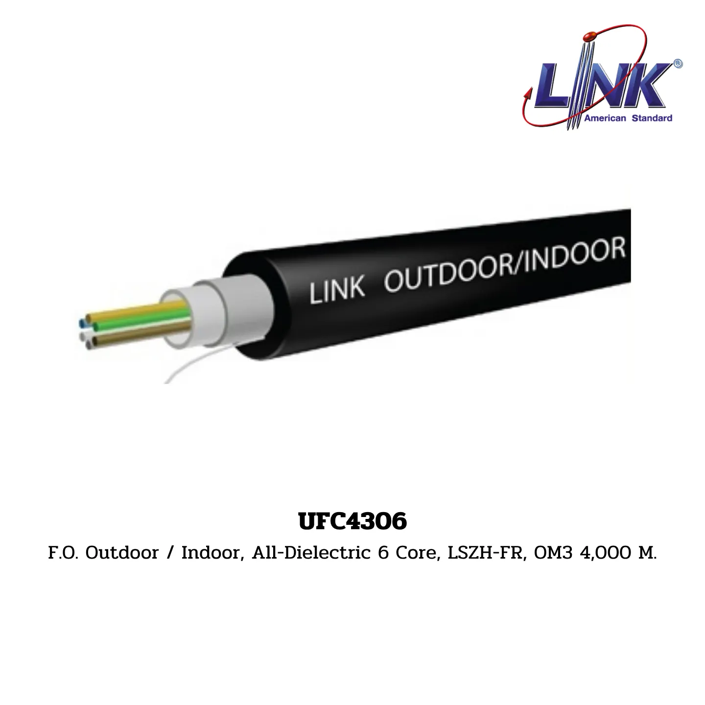 สินค้า F.O. Outdoor / Indoor, All-Dielectric 6 Core, LSZH-FR, OM3 รหัส UFC4306 จากแบรนด์ LINK คือสายไฟเบอร์ออปติกสำหรับใช้งานติดตั้งได้ทั้ง ภายนอกและภายในอาคาร (Outdoor/Indoor) มีจำนวน 6 Core เป็นชนิด Multi-Mode (OM3) ซึ่งเป็นมาตรฐานประสิทธิภาพสูงที่เหมาะสำหรับเครือข่าย 10 Gigabit Ethernet (10GbE) และรองรับความเร็วสูงกว่าในระยะทางที่กำหนด โครงสร้างสายเป็นแบบ All-Dielectric (ไม่มีโลหะ) และเปลือกหุ้มเป็นวัสดุ LSZH-FR (Low Smoke Zero Halogen – Flame Retardant) ที่มีความปลอดภัยสูง