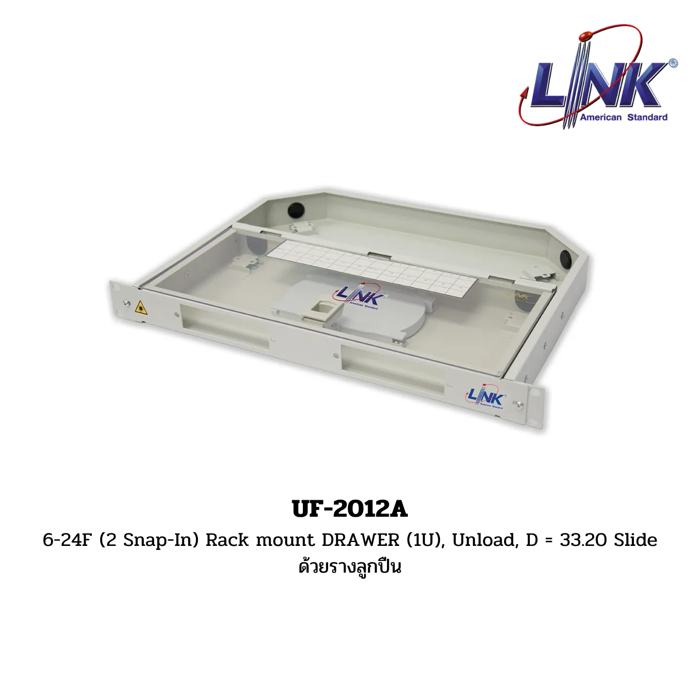 สินค้า 6-24F (2 Snap-In) Rack mount DRAWER (1U), Unload, D = 33.20 Slide ด้วยรางลูกปืน รหัส UF-2012A จากแบรนด์ LINK คือ แผงรวมและกระจายสายใยแก้วนำแสง (Fiber Optic Distribution Panel – FDU) ที่ติดตั้งในตู้แร็คขนาด 19 นิ้ว (19″) และมีความสูง 1 หน่วย (1U) มีลักษณะเป็น แบบลิ้นชัก (DRAWER) ที่เลื่อนออกมาได้ด้วย รางลูกปืน เพื่อความสะดวกในการทำงานและการจัดการสาย แผงเปล่า (Unload) นี้รองรับการติดตั้งสูงสุดได้ 6-24 คอร์ ผ่านช่องสำหรับติดตั้งแผงอะแดปเตอร์ (Snap-In) จำนวน 2 ช่อง โดยมีความลึกของตัวถัง 33.20 เซนติเมตร (ซม.)