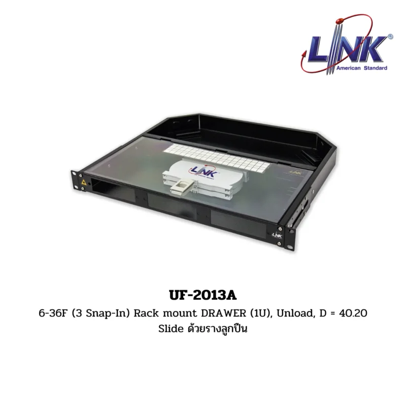 สินค้า 6-36F (3 Snap-In) Rack mount DRAWER (1U), Unload, D = 40.20 Slide ด้วยรางลูกปืน รหัส UF-2013A จากแบรนด์ LINK คือ แผงรวมและกระจายสายใยแก้วนำแสง (Fiber Optic Distribution Panel – FDU) ที่ติดตั้งในตู้แร็คขนาด 19 นิ้ว (19″) และมีความสูง 1 หน่วย (1U) มีลักษณะเป็น แบบลิ้นชัก (DRAWER) ที่เลื่อนออกมาได้ด้วย รางลูกปืน เพื่อความสะดวกในการจัดการสาย แผงเปล่า (Unload) นี้รองรับการติดตั้งสูงสุดได้ 6-36 คอร์ ผ่านช่องสำหรับติดตั้งแผงอะแดปเตอร์ (Snap-In) จำนวน 3 ช่อง โดยมีความลึกของตัวถัง 40.20 เซนติเมตร (ซม.)