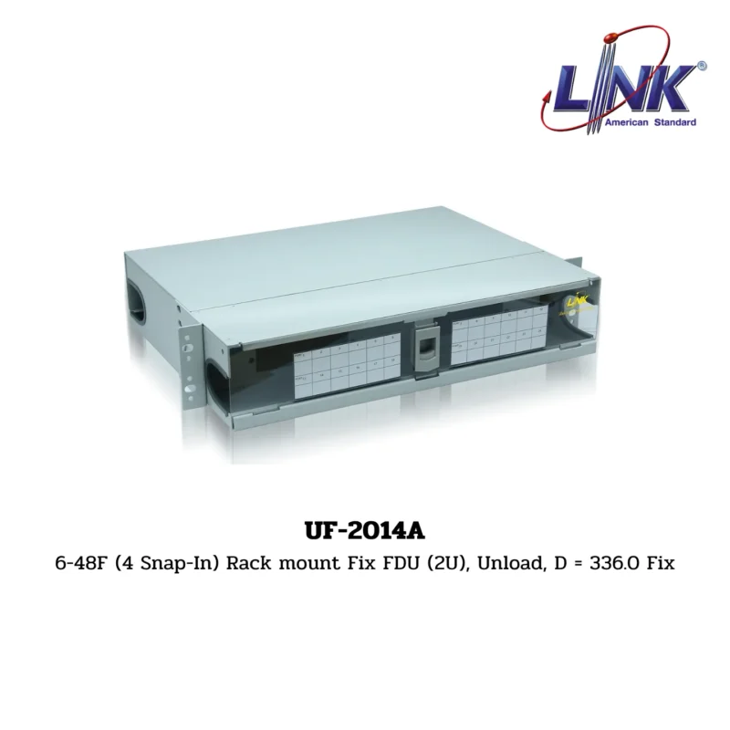 สินค้า 6-48F (4 Snap-In) Rack mount Fix FDU (2U), Unload, D = 336.0 Fix รหัส UF-2014A จากแบรนด์ LINK คือ แผงรวมและกระจายสายใยแก้วนำแสง (Fiber Optic Distribution Panel – FDU) ที่ติดตั้งในตู้แร็คขนาด 19 นิ้ว (19″) มีความสูง 2 หน่วย (2U) และเป็นแบบ ยึดแน่น (Fixed) ซึ่งหมายถึงไม่สามารถเลื่อนเข้าออกได้ แผงเปล่า (Unload) นี้รองรับการติดตั้งสูงสุดได้ 6-48 คอร์ ผ่านช่องสำหรับติดตั้งแผงอะแดปเตอร์ (Snap-In) จำนวน 4 ช่อง โดยมีความลึกของตัวถัง 33.60 เซนติเมตร (ซม.)