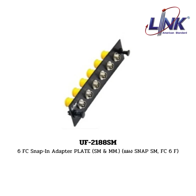สินค้า 6 FC Snap-In Adapter PLATE (SM & MM.) (แผง SNAP SM, FC 6 F) รหัส UF-2188SM จากแบรนด์ LINK คือ แผงหน้ากากอะแดปเตอร์ (Adapter Plate) แบบ Snap-In ที่ใช้สำหรับติดตั้งในแผงกระจายสายใยแก้วนำแสง (FDU/FDB) ที่มีช่อง Snap-In โดยเฉพาะ แผงนี้มาพร้อมกับช่องสำหรับติดตั้ง FC Adapter จำนวน 6 ช่อง ทำให้สามารถเชื่อมต่อสายไฟเบอร์ออปติกได้รวม 6 คอร์ (6F) โดยเป็นชนิดที่ รองรับทั้ง Single-mode (SM.) และ Multi-mode (MM.)