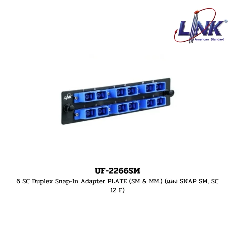 สินค้า 6 SC Duplex Snap-In Adapter PLATE (SM & MM.) (แผง SNAP SM, SC 12 F) รหัส UF-2266SM จากแบรนด์ LINK คือ แผงหน้ากากอะแดปเตอร์ (Adapter Plate) แบบ Snap-In ที่ใช้สำหรับติดตั้งในแผงกระจายสายใยแก้วนำแสง (FDU/FDB) ที่มีช่อง Snap-In โดยเฉพาะ แผงนี้มาพร้อมกับช่องสำหรับติดตั้ง SC Duplex Adapter จำนวน 6 ช่อง ทำให้สามารถเชื่อมต่อสายไฟเบเบอร์ออปติกได้รวม 12 คอร์ (12F) โดยเป็นชนิดที่ รองรับทั้ง Single-mode (SM.) และ Multi-mode (MM.)