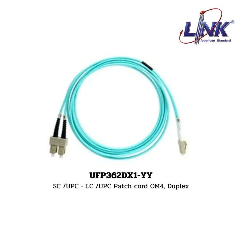 สินค้า SC /UPC – LC /UPC Patch cord OM4, Duplex รหัส UFP362DX1-YY จากแบรนด์ LINK คือ สาย Patch Cord ไฟเบอร์ออปติก (สายต่อสําหรับตู้ Rack) แบบผสมหัวต่อ (Hybrid) ใช้หัวต่อ SC Duplex ด้านหนึ่ง และ LC Duplex อีกด้านหนึ่ง โดยหัวต่อทั้งสองขัดปลายแบบ UPC (Ultra Physical Contact) ตัวสายเป็นชนิด Multimode (MM) OM4 ซึ่งเป็นเกรดประสิทธิภาพสูงที่รองรับความเร็วสูงระดับ 10/40/100 Gigabit Ethernet รหัส -YY ในท้ายรหัสสินค้านี้จะถูกแทนที่ด้วยรหัสความยาวเมื่อมีการสั่งซื้อจริง