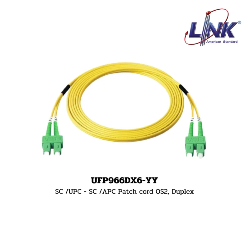 สินค้า SC /UPC – SC /APC Patch cord OS2, Duplex รหัส UFP966DX6-YY จากแบรนด์ LINK คือ สาย Patch Cord ไฟเบอร์ออปติก (สายต่อสําหรับตู้ Rack) แบบผสมชนิดการขัดปลาย (Hybrid Polish) ใช้หัวต่อชนิด SC Duplex ทั้งสองด้าน แต่ขัดปลายต่างกัน คือ UPC ด้านหนึ่ง และ APC อีกด้านหนึ่ง ตัวสายเป็นชนิด Single-mode (SM) OS2 สำหรับการใช้งานระยะไกล รหัส -YY ในท้ายรหัสสินค้านี้จะถูกแทนที่ด้วยรหัสความยาวเมื่อมีการสั่งซื้อจริง
