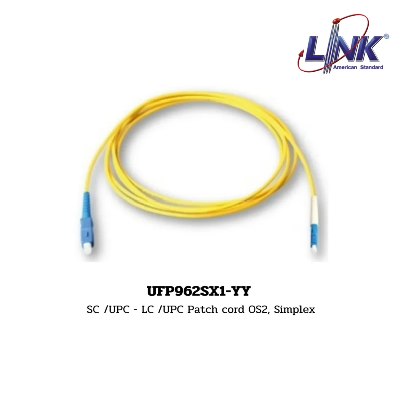สินค้า SC /UPC – LC /UPC Patch cord OS2, Simplex รหัส UFP962SX1-YY จากแบรนด์ LINK คือ สาย Patch Cord ไฟเบอร์ออปติก (สายต่อสําหรับตู้ Rack) แบบผสมหัวต่อ (Hybrid) ใช้หัวต่อ SC Simplex ด้านหนึ่ง และ LC Simplex อีกด้านหนึ่ง โดยหัวต่อทั้งสองขัดปลายแบบ UPC (Ultra Physical Contact) ตัวสายเป็นชนิด Single-mode (SM) OS2 สำหรับการใช้งานระยะไกล รหัส -YY ในท้ายรหัสสินค้านี้จะถูกแทนที่ด้วยรหัสความยาวเมื่อมีการสั่งซื้อจริง