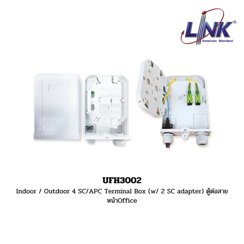 สินค้า Indoor / Outdoor 4 SC/APC Terminal Box รหัส UFH3002 จากแบรนด์ LINK คือตู้รวมสาย (Terminal Box) ที่ออกแบบมาเพื่อใช้เป็นจุดเชื่อมต่อและกระจายสายไฟเบอร์ออปติกบริเวณหน้า Office หรือจุดรวมสายในอาคาร รองรับการต่อสายได้สูงสุด 4 Core/Port และสามารถติดตั้งได้ทั้ง ภายใน (Indoor) และ ภายนอก (Outdoor) ตู้มาพร้อม อะแดปเตอร์ SC/APC จำนวน 2 ตัว และมีความสามารถในการจัดเก็บสายไฟเบอร์ออปติกได้อย่างเป็นระเบียบ